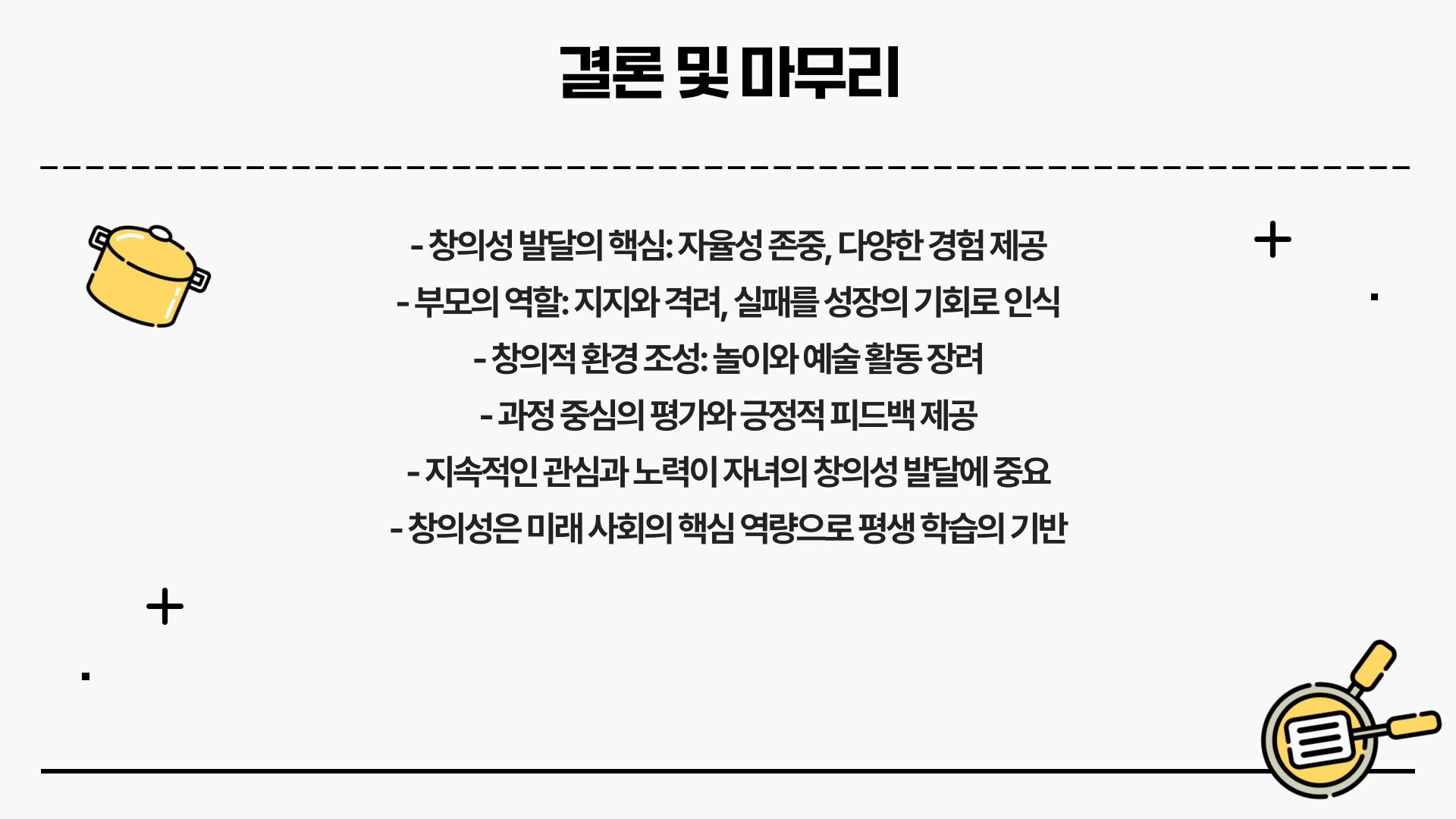 창의성을 키우는 것은 단순히 특별한 교육을 받게 하는 것이 아니라, 부모가 아이의 생각을 존중하고 자유롭게 표현할 기회를 주는 것에서 시작됩니다. 자녀가 창의적인 인재로 성장할 수 있도록 긍정적인 환경을 만들어 주세요!
