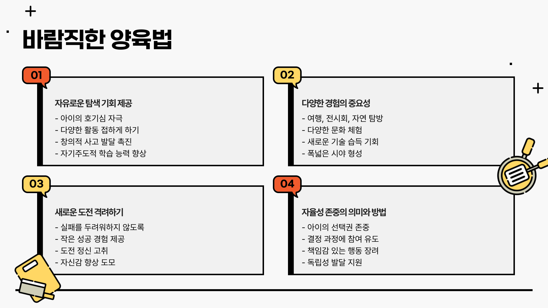 ✔ 아이가 스스로 생각하고 결정할 수 있도록 자유를 줍니다.