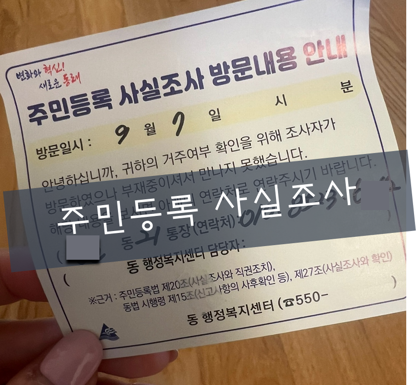 이를 통해 얻은 정확한 정보를 통해 행정서비스개선 및 선거나 복지 관리, 재해 등 다양한 목적으로 정부에서 활용한다고 합니다. 비대면 시기는 지나 저처럼 대면인 경우  담당공무원이나 각 동 통장님들이 돌아다니며 직접 확인하고, 부재중일시에는 위에 사진처럼 스티커가 부착되니 남긴 전화번호로  꼭 조사에 응하시면 됩니다.