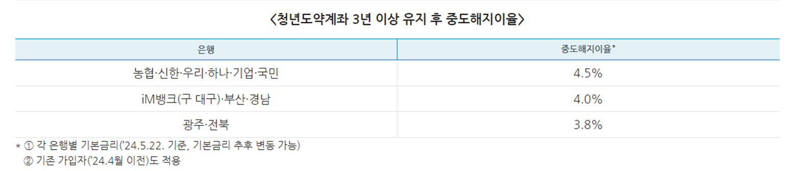 이제 3년만 유지해도 거의 모든 혜택들이 사라지지 않고 유지되며, 중도해지를 하더라고 기존 은행 금리와 비슷하게 유지되기 때문에 청년이라면 가입조건이 되는 한 무조건 추천해보는 계좌입니다.