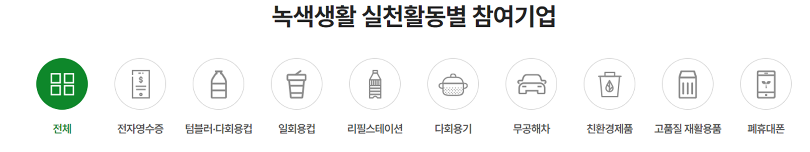종이대신 전자영수증 발급, 텀블러나 다회용컵 이용, 일회용컵 반환, 리필스테이션 이용, 다회용기 사용