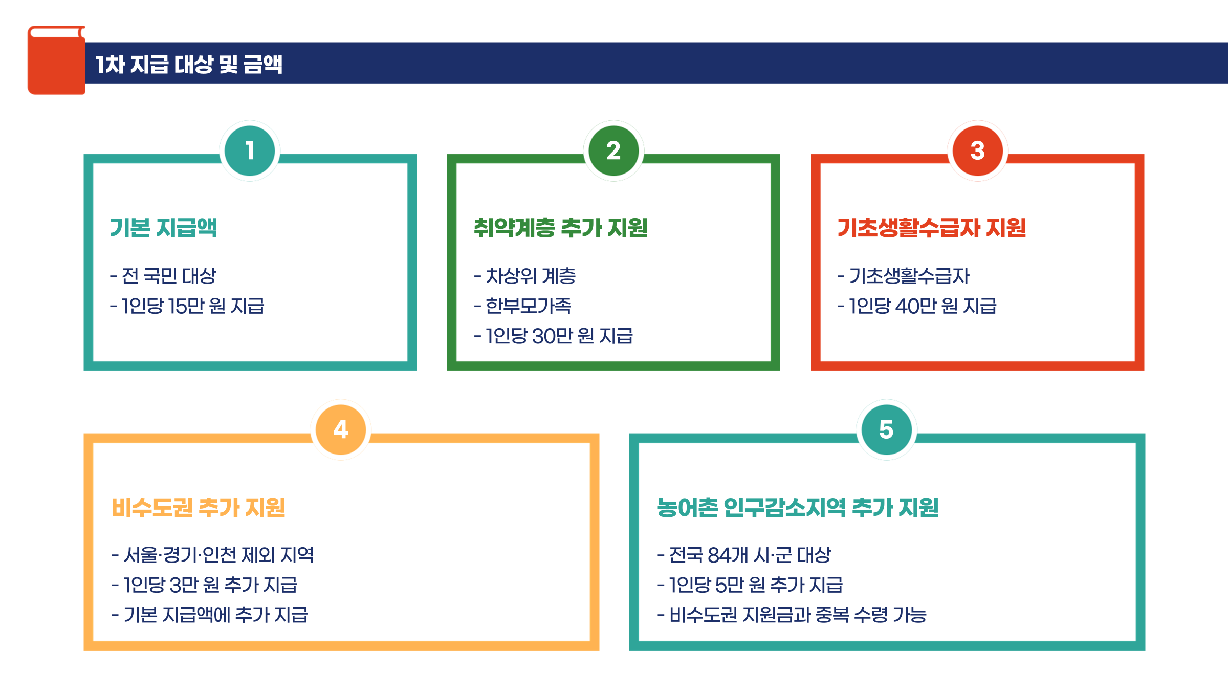 2. 1차 지급 대상 및 금액전 국민을 대상으로 지급되며 취약계층 및 한부모 가족에게는 추가 지급됩니다.