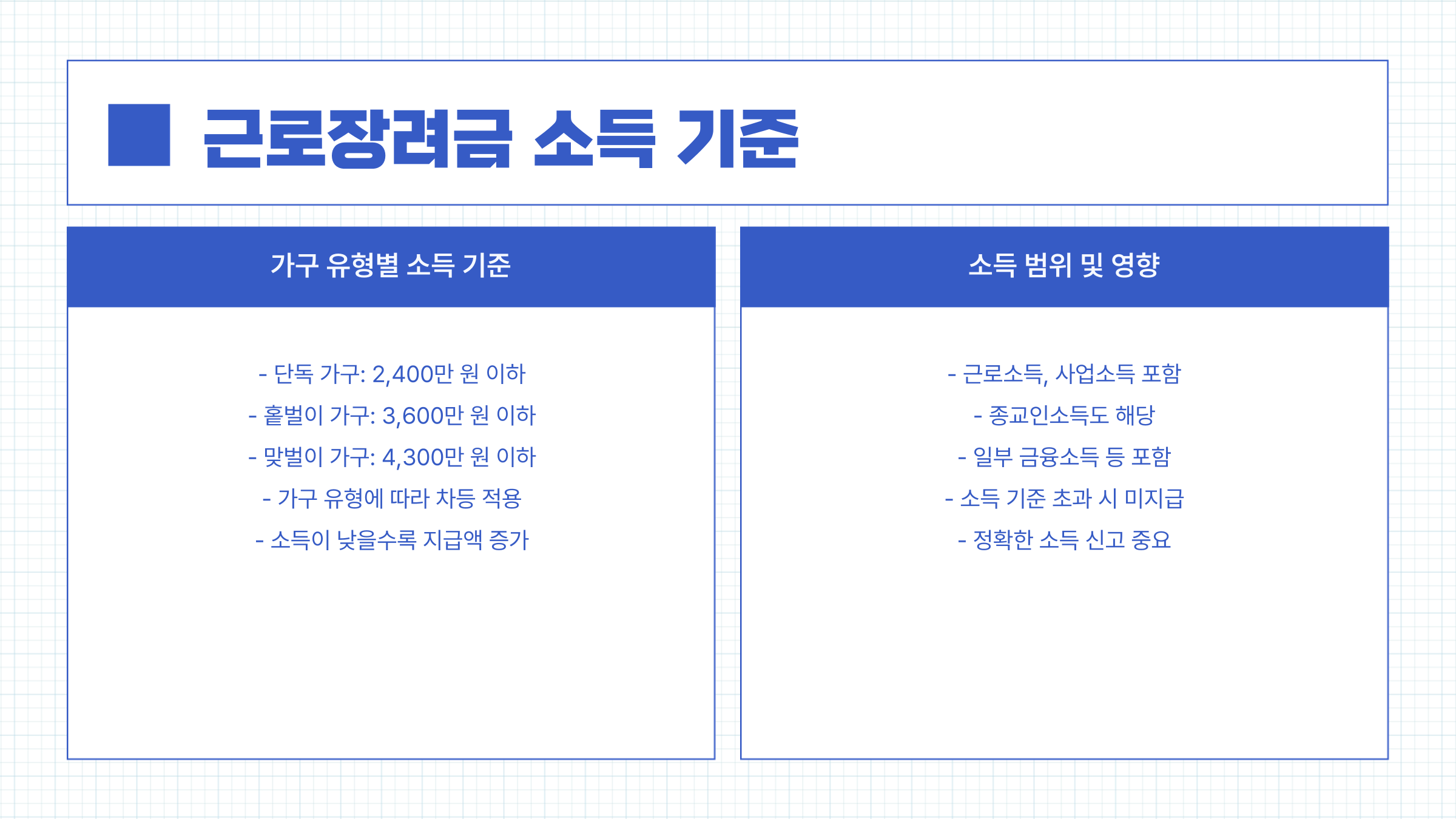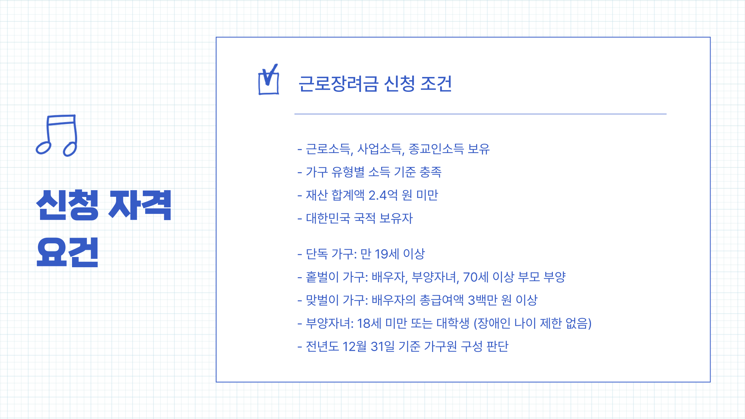 근로장려금을 받기 위해서는 일정 소득 요건을 충족해야 합니다. 소득 기준은 가구 유형별로 다르며, 2025년 기준은 다음과 같습니다.